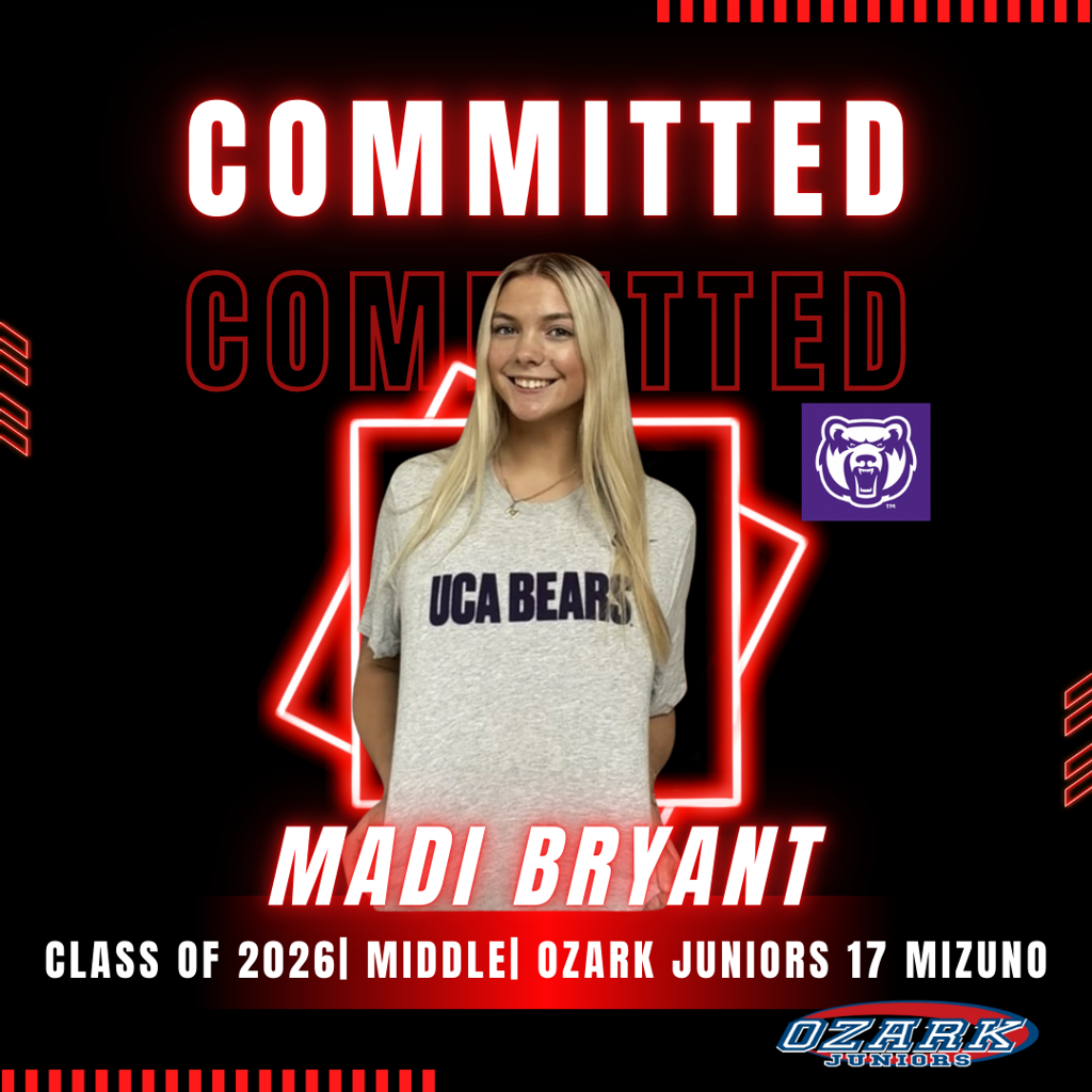 Congratulations to Madi Bryant (Middle Hitter- 17 Mizuno - Class of 2026) on her commitment to play volleyball and attend University of Central Arkansas in the Fall of 2026. Way to go Madi, we are so proud of you!!